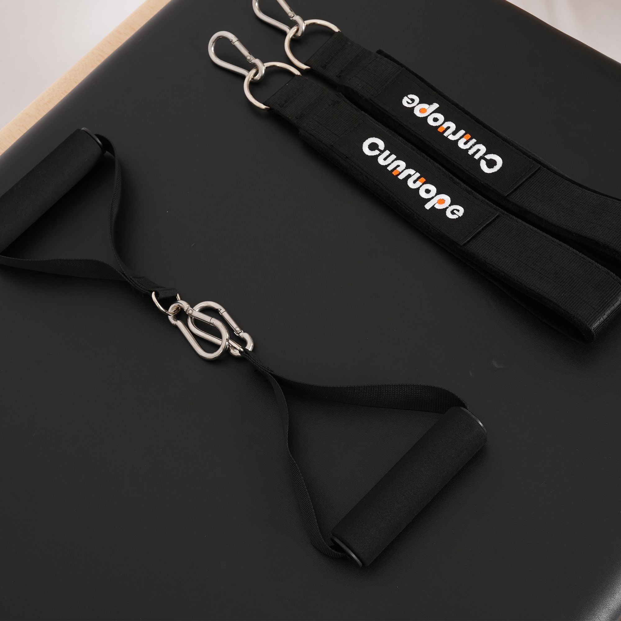 Des poignées en mousse se fixent aux cordes du Reformer, ainsi que des ressorts de bras légers pour le travail sur cadre vertical et sur Cadillac. Ces poignées sont rembourrées et arrondies pour un confort accru.